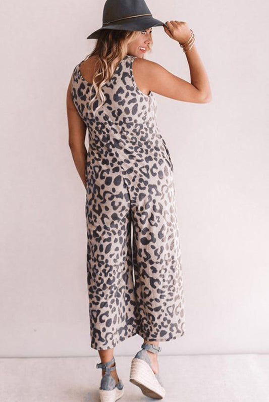 Leopard Print Pockets Wide Leg Jumpsuit