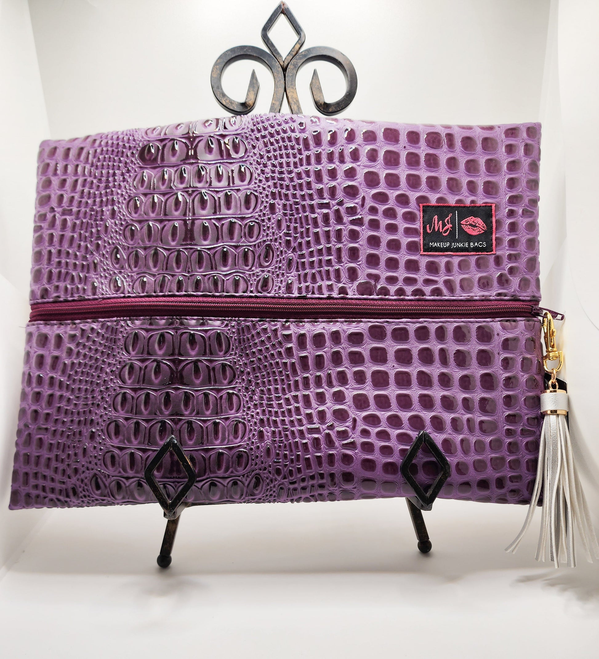 The Bubble Gator Amethyst bag is a vegan gator leather exterior with an silver wipeable interior.