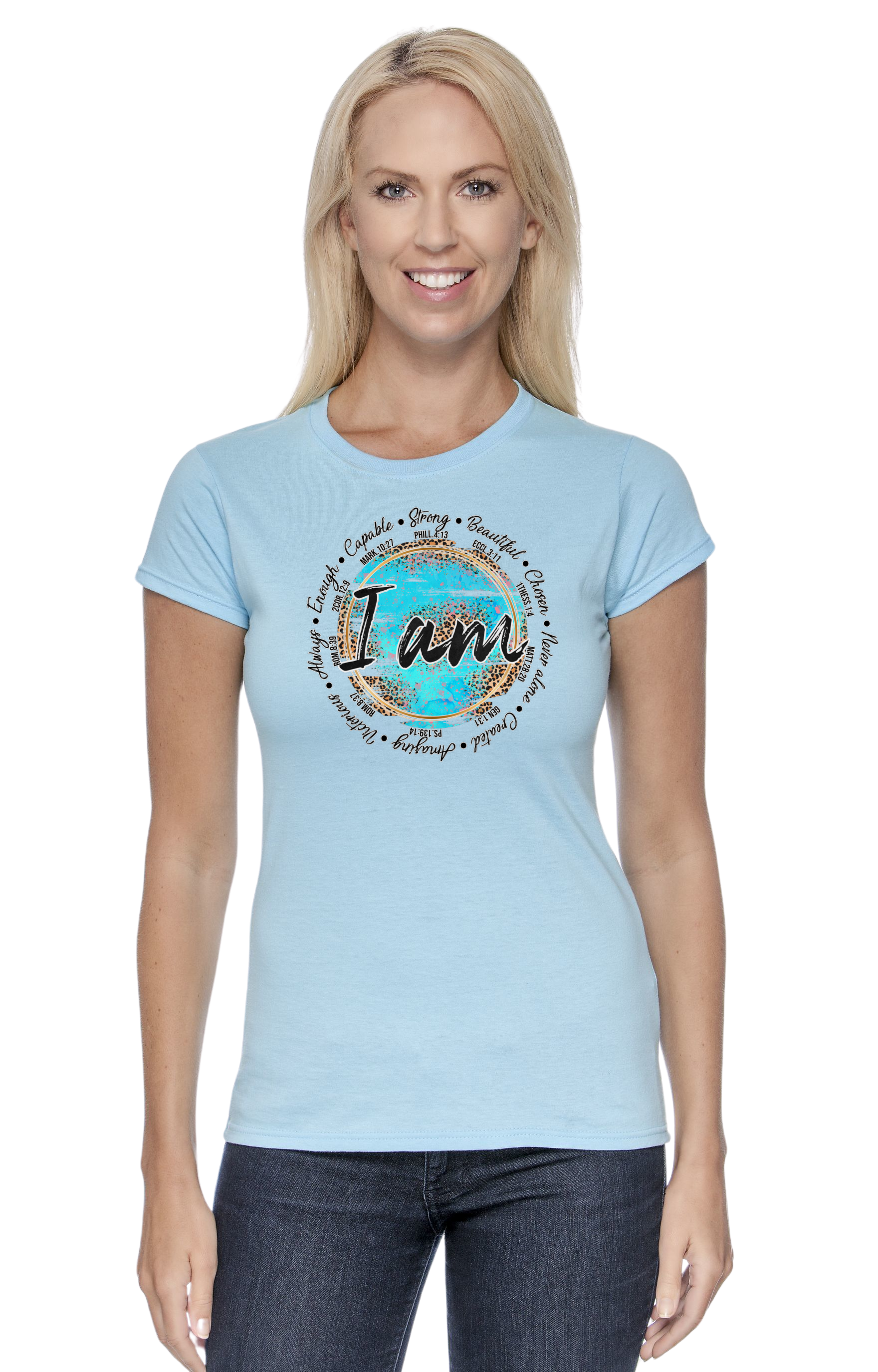 This unisex graphic tee is available in several colors. Available in sizes small through 3x. Extra small, 4X and 5X available upon request. Shown in white and light blue.